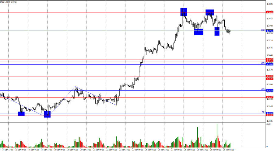 الخلفية الإخبارية يوم الخميس كانت غائبة تقريبًا، لكن السوق ينتظر حل الوضع مع إيران. أذكركم أن دونالد ترامب أعلن فعليًا عن ضربات صاروخية جديدة على الدولة الشرق أوسطية، حيث رفضت طهران الموافقة على نزع السلاح النووي. بالإضافة إلى ذلك، منذ ديسمبر من العام الماضي، اجتاحت البلاد احتجاجات وأعمال شغب جماهيرية بين السكان الذين يطالبون باستقالة الحكومة الحالية. وصف ترامب المتظاهرين بأنهم "أشخاص شجعان" وهو مستعد لتقديم كل الدعم الممكن لهم في نضالهم ضد النظام المعادي. إذا أمر ترامب في الأيام القادمة بشن هجوم على إيران، فقد يظهر الدولار نموًا إضافيًا، حيث ستتصاعد التوترات الجيوسياسية مرة أخرى. في الوقت الحالي، نرى أن المضاربين على الهبوط لا يمكنهم حتى الإغلاق تحت مستوى 1.3755، وهو أقرب دعم بعد الارتفاع القوي للجنيه. لا توجد أحداث اقتصادية تقريبًا على جداول المملكة المتحدة والولايات المتحدة اليوم، لذا يجب الانتباه إلى الأخبار من البيت الأبيض والشرق الأوسط.