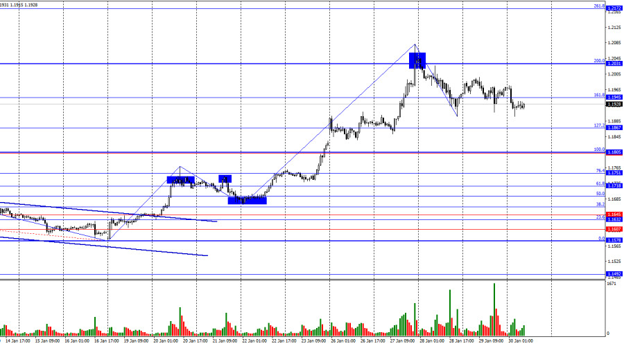 كان هناك القليل جدًا من الأخبار في سوق العملات يوم الخميس - لأول مرة منذ بداية عام 2026. لقد اعتاد دونالد ترامب المتداولين في العام الجديد على تدفق الأخبار اليومي وأوضح أنه لا ينوي تأجيل خططه. لذلك، في المستقبل القريب، قد يتم رفع التعريفات ضد كندا وكوريا الجنوبية، وقد يتم تنفيذ ضربة جوية ضد إيران لدعم المتظاهرين المعارضين للحكومة، ويبدو أن قضية جرينلاند قد تم حلها - رغم أن لا أحد يفهم كيف. في رأيي، تبقى قضية جرينلاند ذات صلة، حيث أنه من غير الواضح تمامًا ما هو موقف الاتحاد الأوروبي والدنمارك بشأن الاتفاقيات بين ترامب وروته. أيضًا هذا الأسبوع، عُقد اجتماع للجنة الفيدرالية للسوق المفتوحة لم تُتخذ فيه أي قرارات مهمة ولم تُصدر أي بيانات هامة. نظرًا لقلة الأخبار الواردة مؤخرًا، يفضل المتداولون البقاء على الهامش والانخراط في حركات تصحيحية. اليوم، سيتم إصدار عدد كبير من التقارير الاقتصادية، خاصة في الاتحاد الأوروبي، لكن السوق ينتظر الأخبار من ترامب.