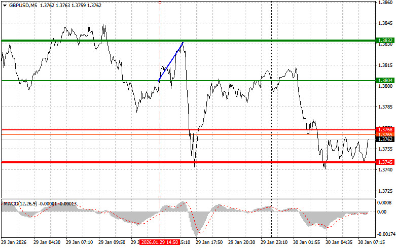 পরিকল্পনা #1: আজ পাউন্ডের মূল্য 1.3739-এর (চার্টে লাল লাইন) লেভেলে পৌঁছানোর পর আমি পাউন্ড বিক্রি করার পরিকল্পনা করছি, যা GBP/USD-এর দ্রুত দরপতনের দিকে নিয়ে যাবে। বিক্রেতাদের জন্য মূল লক্ষ্যমাত্রা হবে 1.3700-এর লেভেল, যেখানে মূল্য পৌঁছালে আমি শর্ট পজিশন ক্লোজ করতে যাচ্ছি এবং অবিলম্বে বিপরীত দিকে লং পজিশন ওপেন করার পরিকল্পনা করছি, এই লেভেল থেকে বিপরীত দিকে 20-25 পিপস মুভমেন্ট হওয়ার আশা করছি। আজ পাউন্ডের বিক্রেতারা যেকোনো সুযোগ কাজে লাগাতে সক্রিয় হতে পারে। গুরুত্বপূর্ণ! বিক্রি করার আগে, নিশ্চিত করুন যে MACD সূচকটি শূন্যের নিচে রয়েছে এবং শূন্যের নিচে নামতে শুরু করেছে।