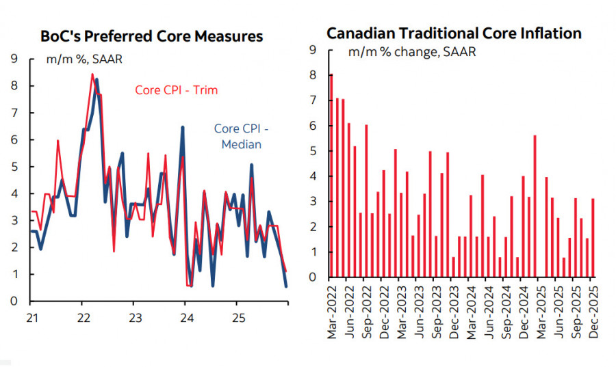 The Canadian consumer price index in December exceeded forecasts, rising from 2.2% year-on-year to 2.4%, but the markets virtually ignored this result. Part of the reason is that the core index dropped from 2.9% year-on-year to 2.8%, and since it is a key indicator for the Bank of Canada, the reaction was calm. The median inflation rate also decreased, with the trend over the last three months showing that the target and median inflation were 1.5% and 1.9% (year-on-year), respectively, both below the Bank of Canada's target of 2%.